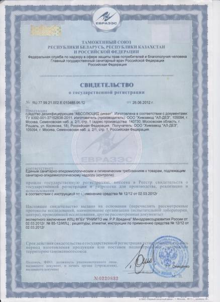 Лучший выбор для металлического транспорта и рефрижераторов. Эффективен против гриппа, полиомиелита и плесневых грибов. Основная особенность — антикоррозийная защита: он абсолютно инертен к металлам и пластику. Сохраняет свои дезинфицирующие свойства даже после замораживания и последующей разморозки.